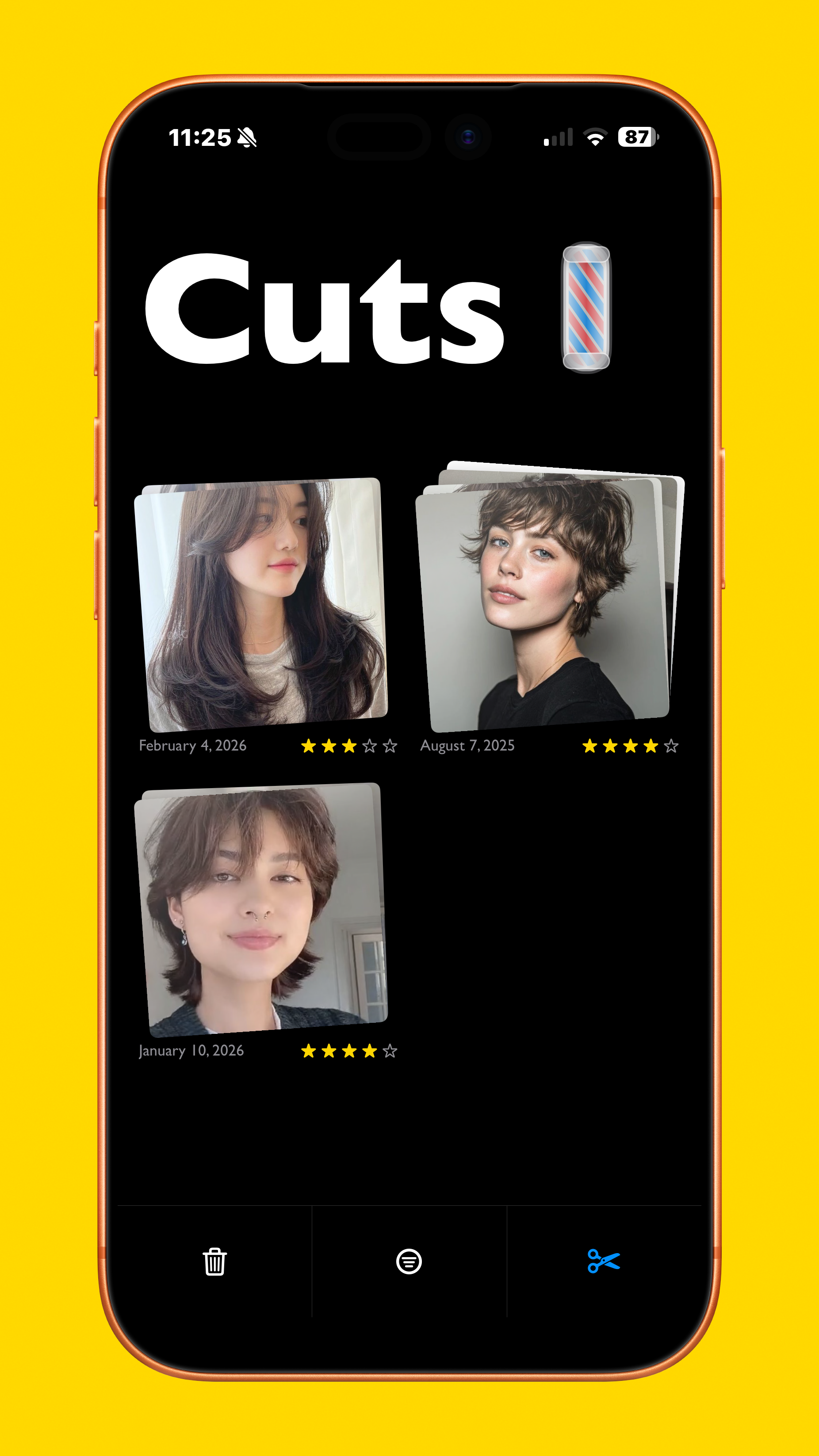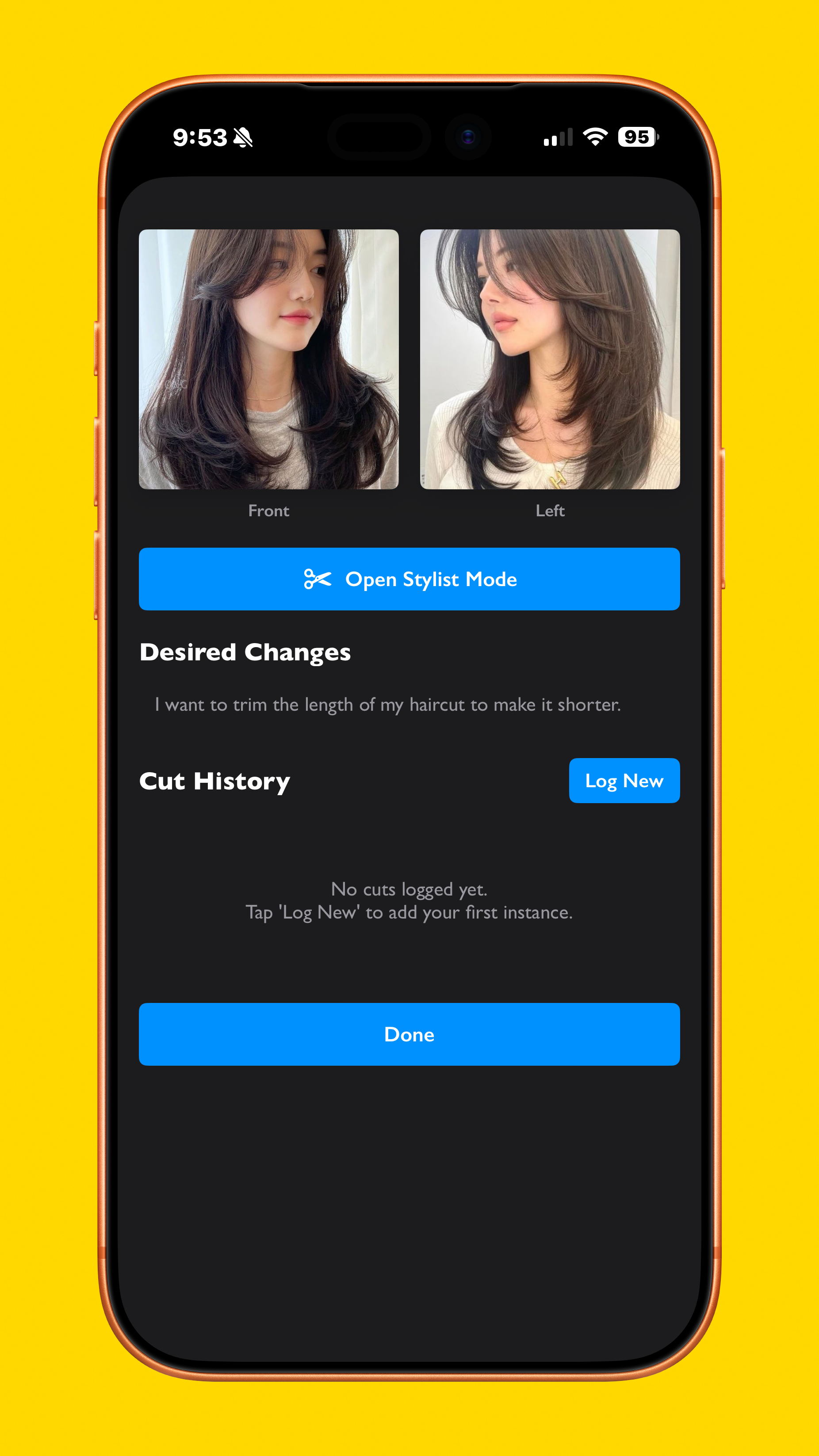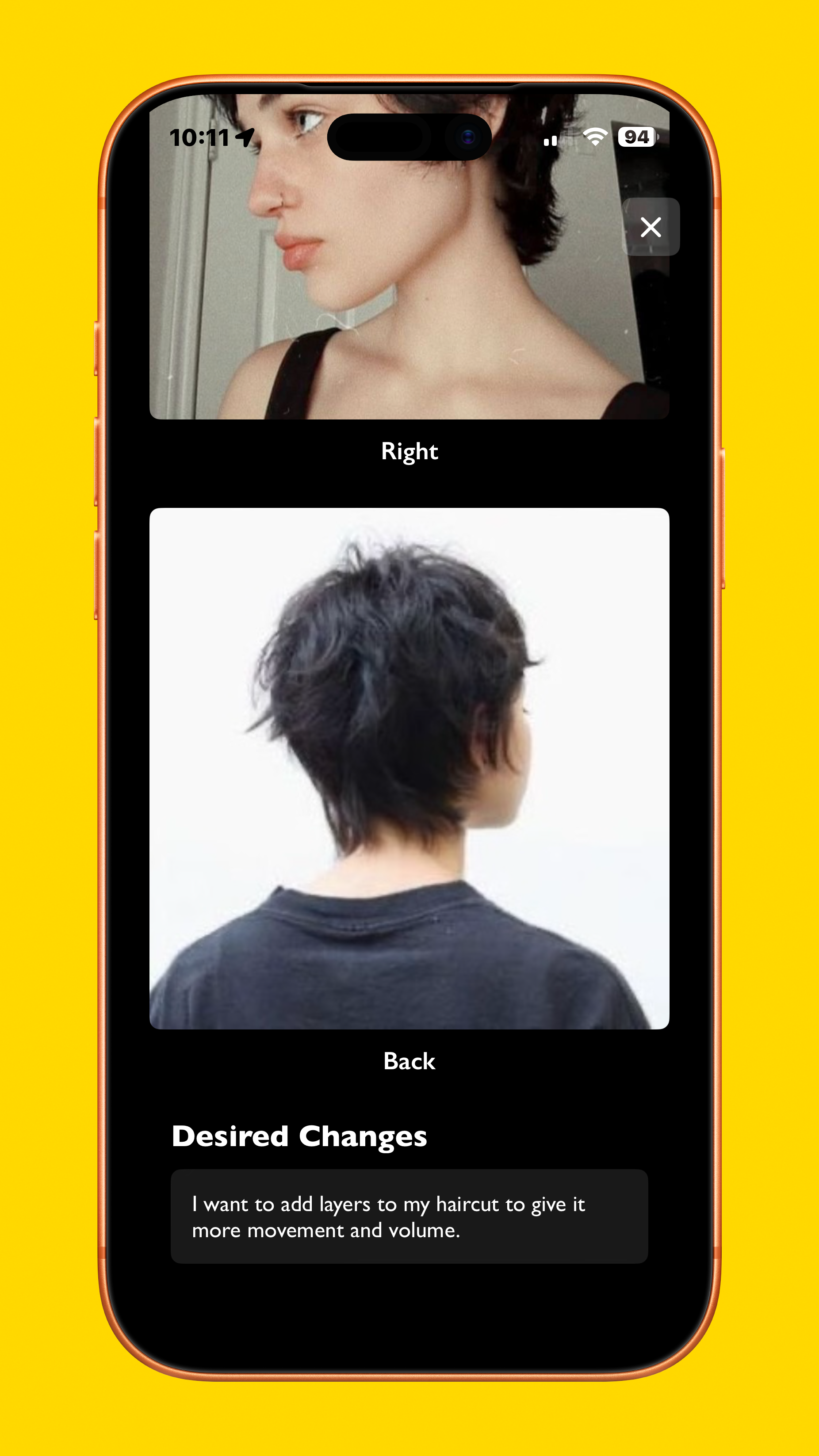 After a new cut is created, it brings users to the cut detail screen, showing a grid of the selected photos, desired changes, cut history, and a way to open Stylist Mode. That mode shows only what is necessary for the stylist, allowing them to scroll through the references, and see any desired changes requested, if any.